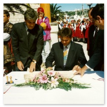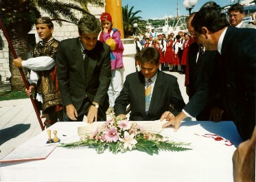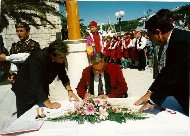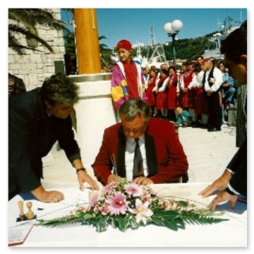 In einem überwältigendem Festakt, und einer feierlichen Zeremonie vor ca. 2000 touristischen Gästen, sowie der heimischen Bevölkerung, wird auf dem festlich geschmückten Rathausplatz von Rab die Partnerschaftsurkunde am 07.September 1996 bei strahlendem Sonnenschein von den Begründern der Städtepartnerschaft unterzeichnet. Der Text